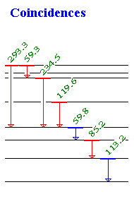 In level plot mode, one or several gamma rays can be selected with the mouse, and gamma rays coincident with the selected gamma(s) can be shown. In the figure the two blue gamma rays have been selected, and the red gammas are shown to be in coincidence with both gammas.